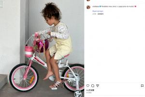 图片中的马蒂娜骑着自行车,似乎还偷穿了妈妈乔治娜的高跟鞋。