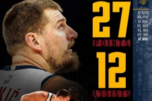此役,官方数据冻结。掘金官方晒出了约基奇本场比赛数据,27分10篮板12助攻,这是他本赛季第7次三双。